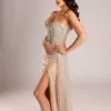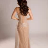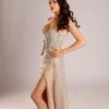 Plongez dans un monde de glamour exquis. Cette robe de soirée haute couture en tissu luxueux pailleté de couleur nude. Cette pièce captivante est confectionnée pour celle qui cherche à briller de mille feux sous les projecteurs de la soirée.