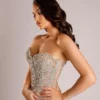 Le bustier de cette robe est une œuvre d’art en soi. Orné de cristaux scintillants qui captent la lumière de façon envoûtante à chaque mouvement. Chaque cristal est méticuleusement disposé pour créer un motif étincelant qui  souligne  la silhouette.